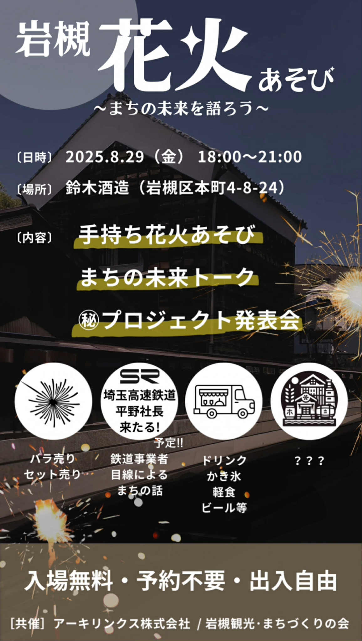 岩槻の歴史ある鈴木酒造において、手持ち花火を楽しんだり、岩槻の未来についてトークできるイベントが開催されます。